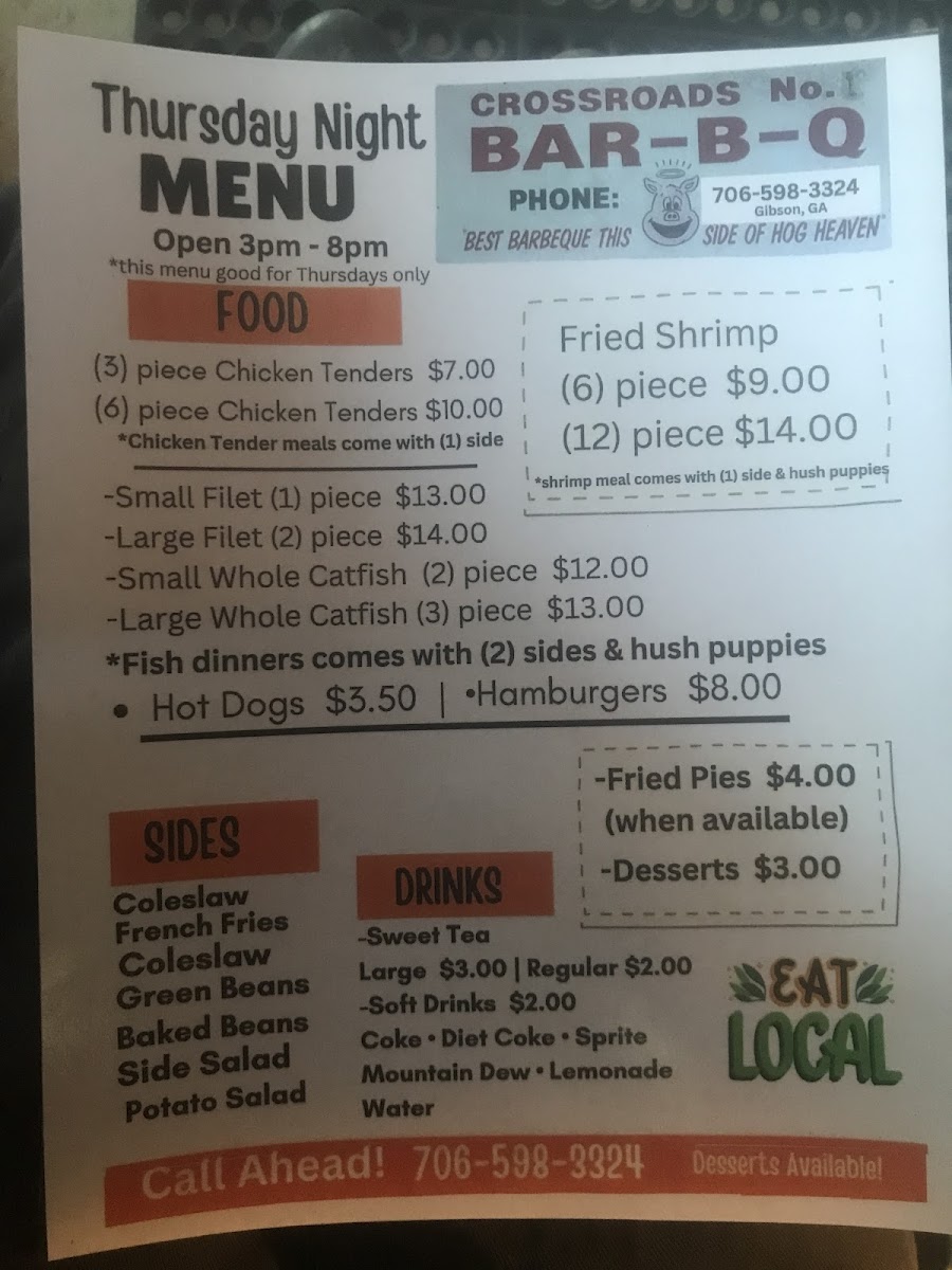 Looking for a mouthwatering experience? The Crossroad Barbecue Menu is your go-to destination for delicious, smoky flavors that will leave you craving more. Located at 5494 Wayne Landrum Rd, Gibson, GA, this spot is perfect for those who appreciate the rich, savory taste of authentic barbecue. Whether you're in the mood for tender pulled pork, perfectly grilled ribs, or flavorful brisket, Crossroad has something to satisfy every taste. Their menu also features classic sides like creamy mac and cheese, crispy fries, and tangy coleslaw - the ideal complement to your meal. From the first bite to the last, every dish is crafted with care, making it a great place to enjoy hearty, satisfying food with family and friends. The laid-back atmosphere makes it the perfect spot to unwind and enjoy a great meal at your own pace.